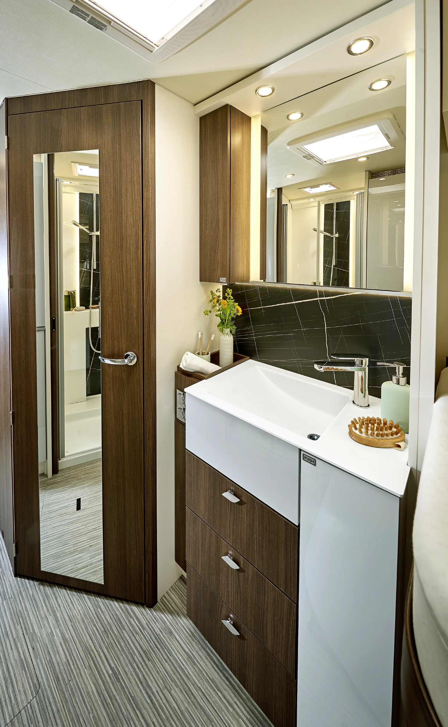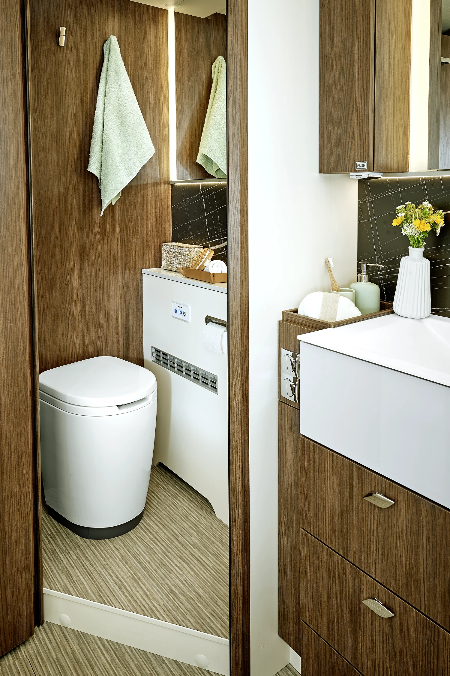- oddzielna kabina prysznicowa z ogrzewaną podłogą, stylowa łazienka z lustrem, automatyczny system sanitarny (z toaletą wyposażoną w neutralizatorów zapachów)