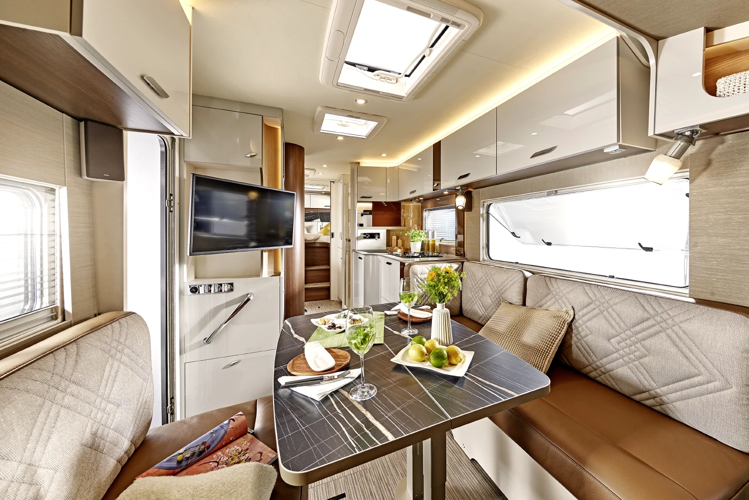 Linia kamperów zintegrowanych Elegance powstała z myślą o osobach, które nade wszystko cenią sobie swobodę i dużą przestrzeń. Niemiecki producent pojazdów kempingowych wykorzystał w tym projekcie nowoczesne rozwiązania, które w pełni usatysfakcjonują najbardziej wymagających użytkowników. Kamper o długości 899 cm posiada nie tylko komfortową sypialnię, ale również wspaniale wyposażoną łazienkę i kuchnię. Zwieńczeniem eleganckiego projektu jest przestronny salon, który zaprasza do wspólnych posiłków i długich rozmów. Co ważne – w standardowym wyposażeniu uwzględnione zostało specjalne miejsce na telewizor, co będzie dużym atutem dla niejednego kinomana.