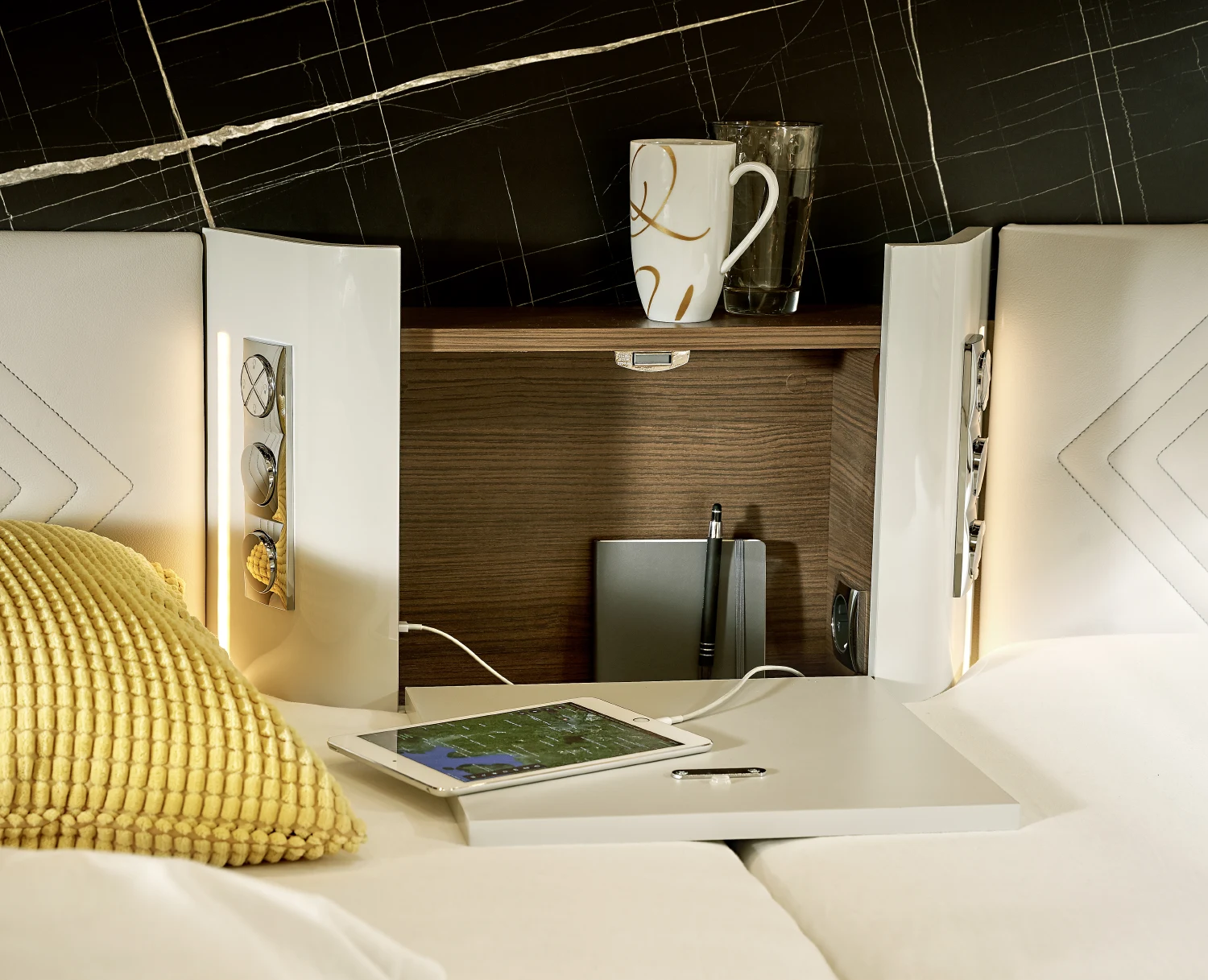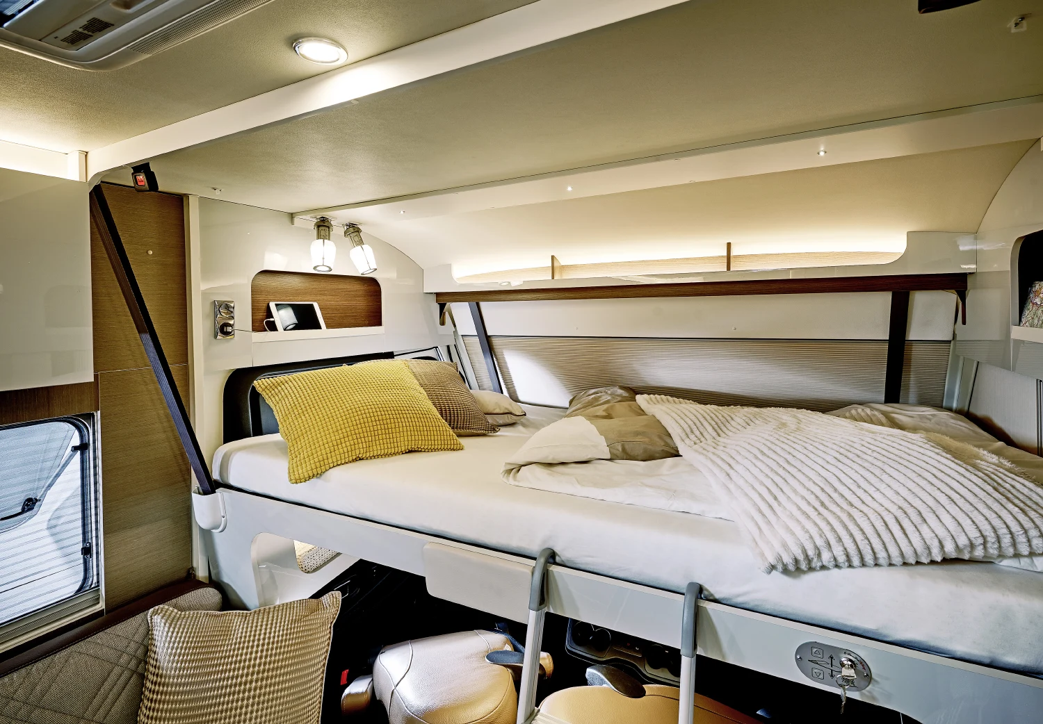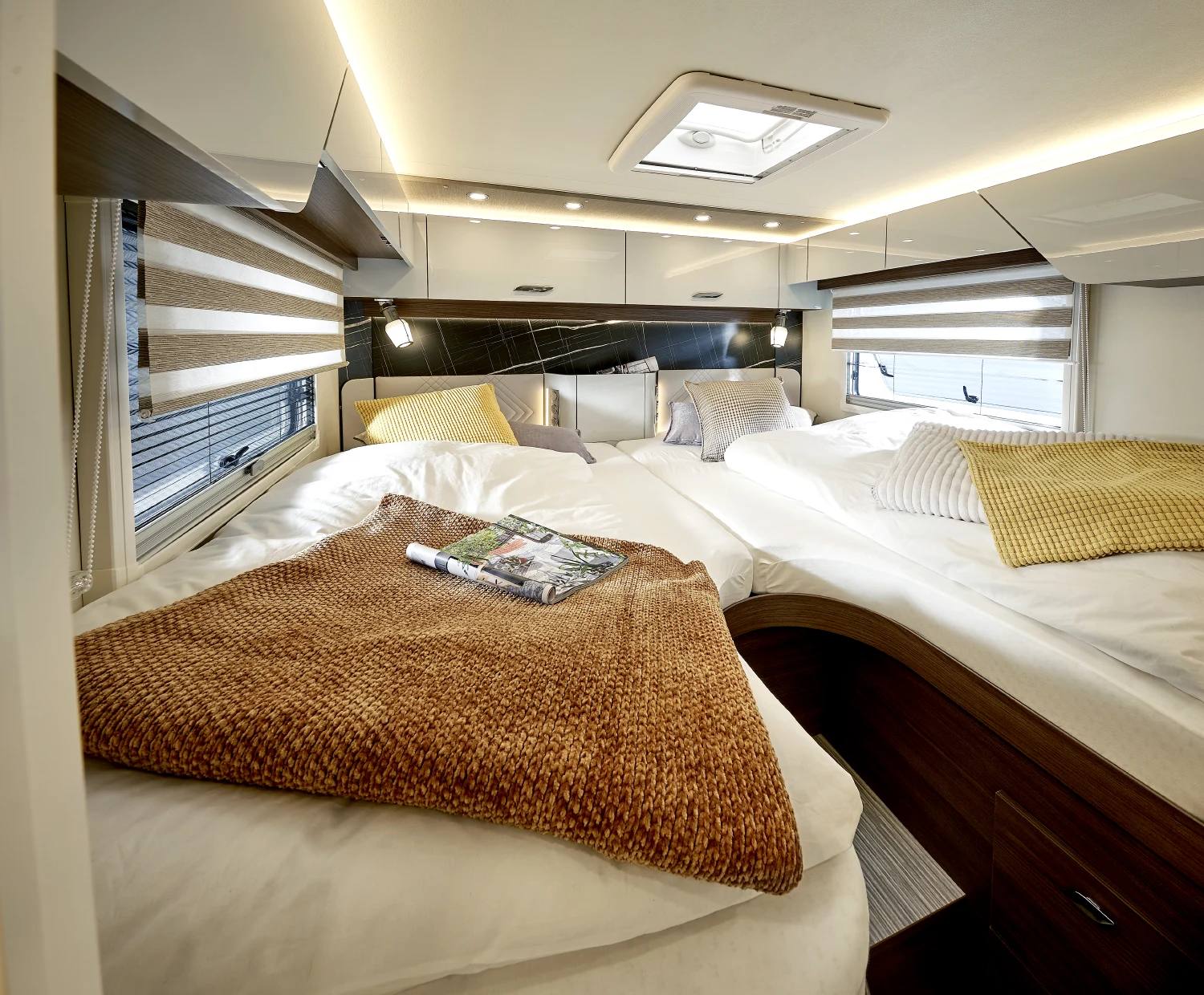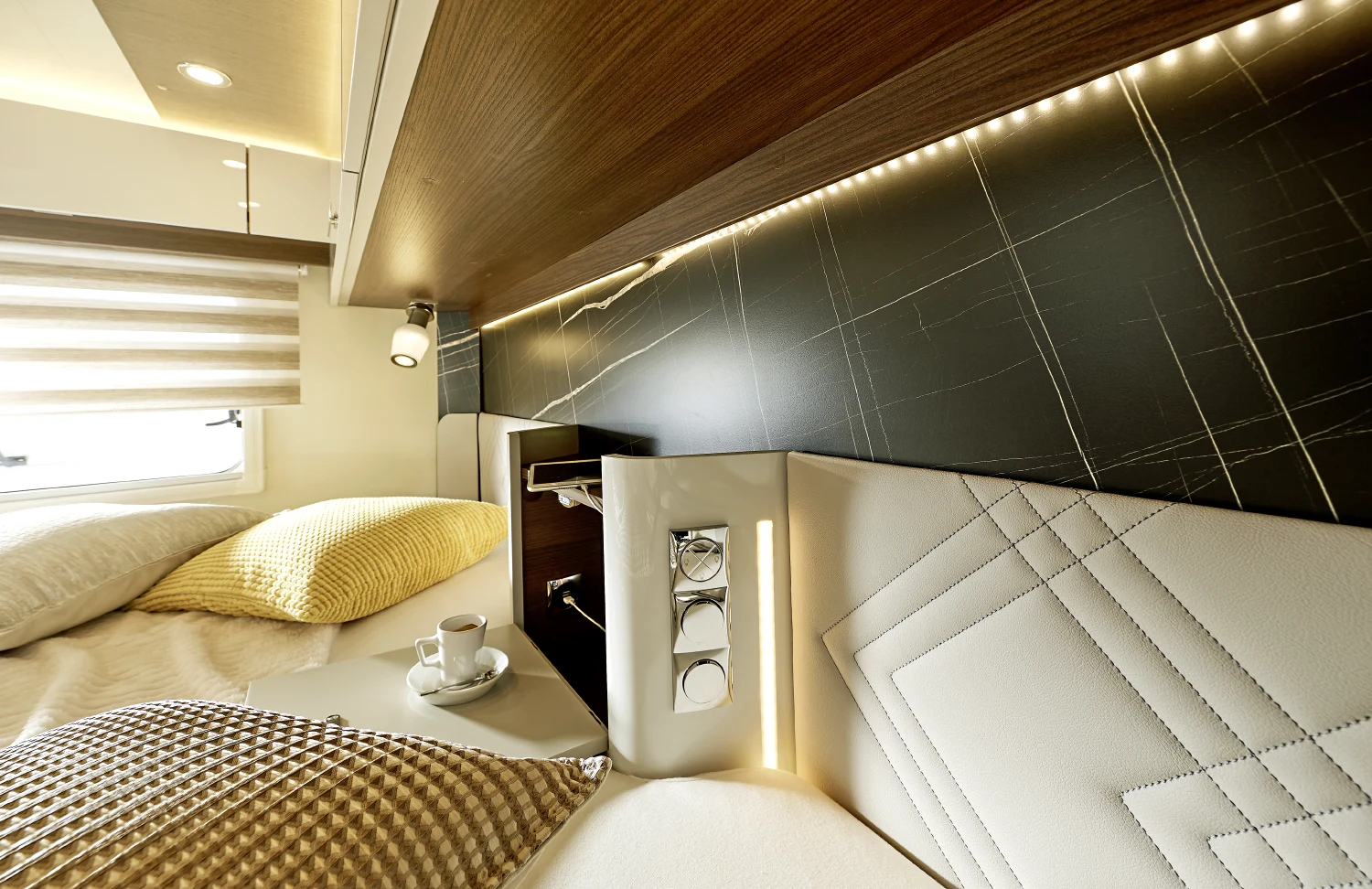 - luksusowa strefa sypialna z wielostrefowymi materacami, w części dziennej elektrycznie opuszczane łóżko
