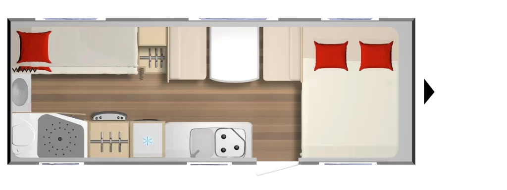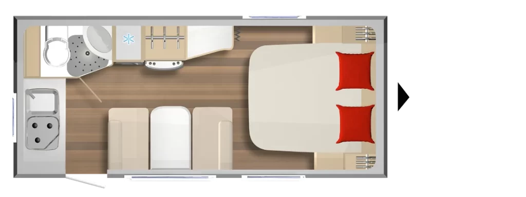 - kuchenka 3-palnikowa gazowa, lodówka 90 l lub 142 l (w zależności od modelu)