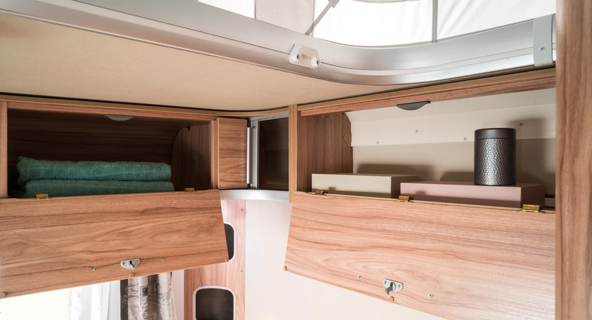 - dużo przestrzeni do przechowywania – schowki podsufitowe w części dziennej i sypialnej