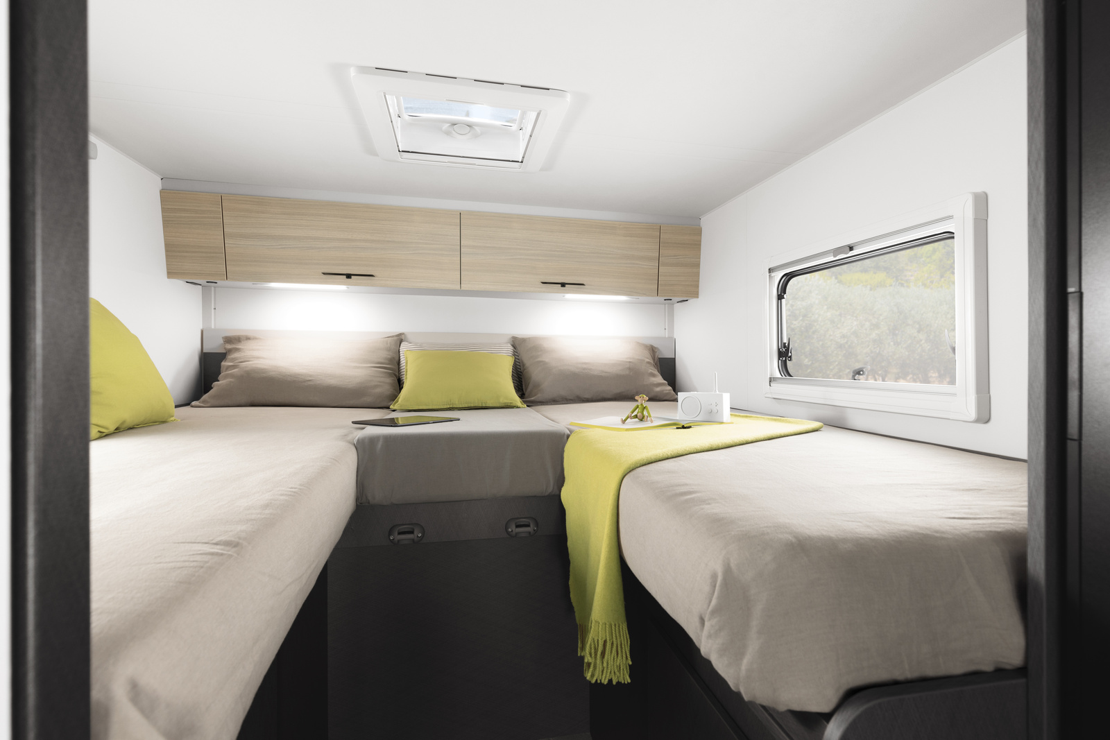 - Stałe łóżko w alkowie z bocznym oknem i siatką zabezpieczającą dla najmłodszych pasażerów.