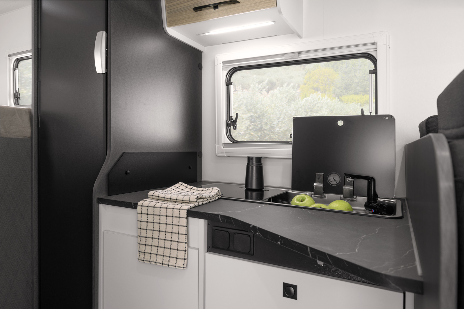 - Duża lodówka o pojemności 135 litrów z osobnym zamrażalnikiem na zapasy na długie trasy.