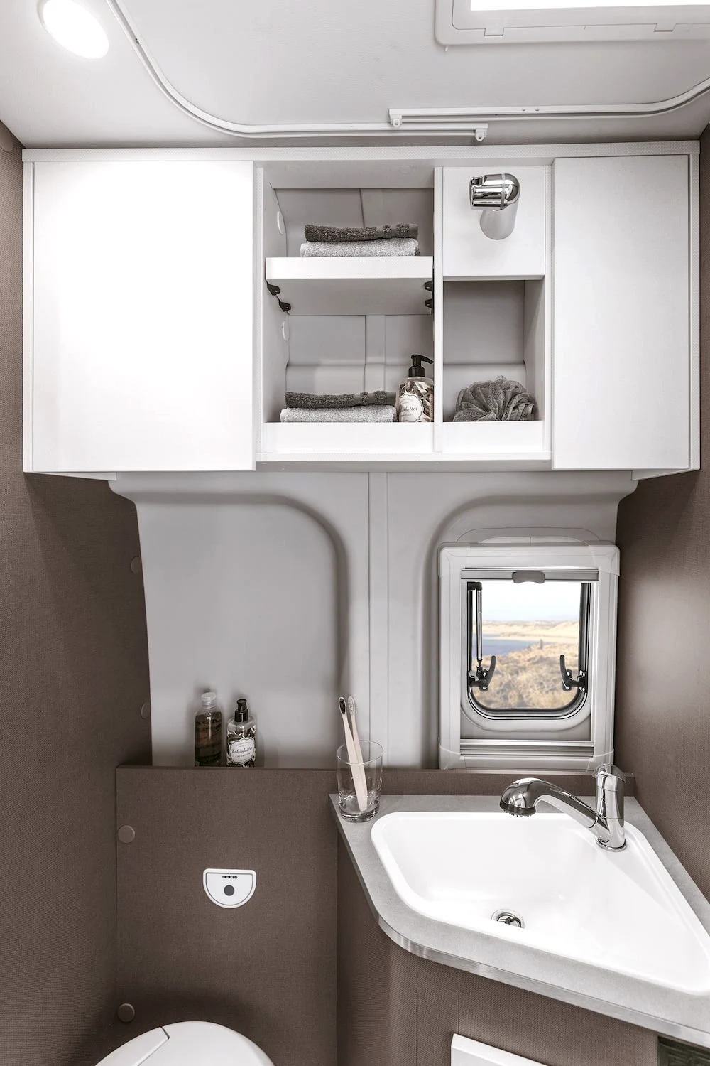 • okna z podwójnymi szybami, wyposażone w moskitiery i rolety zaciemniające, duże okno dachowe lub panoramiczne nad kabiną kierowcy
