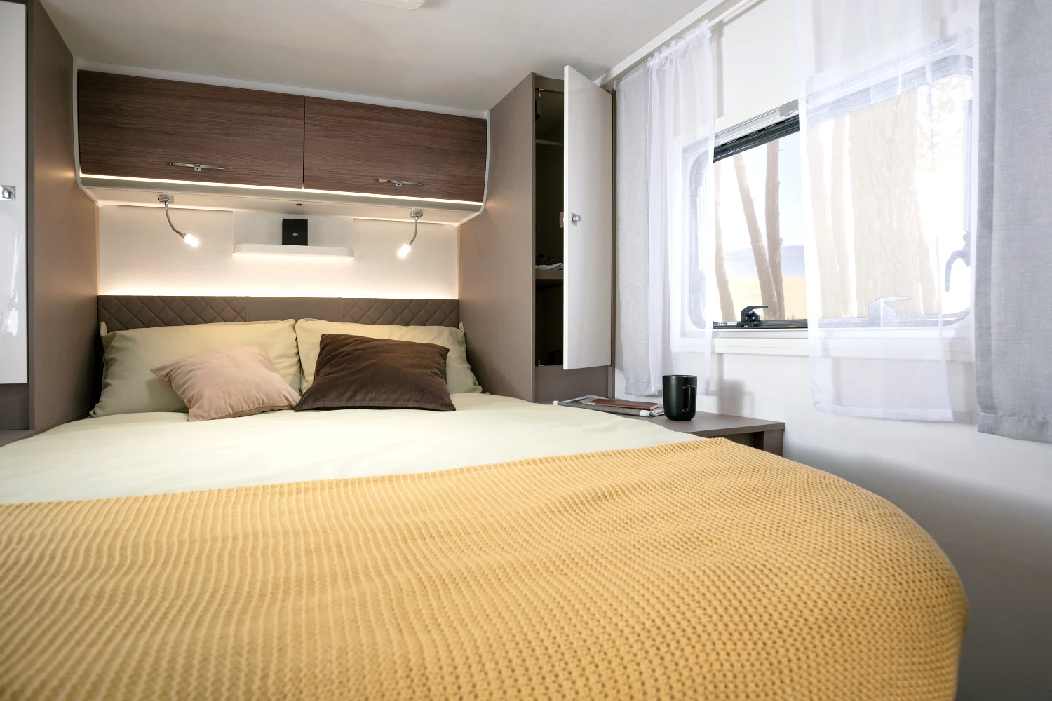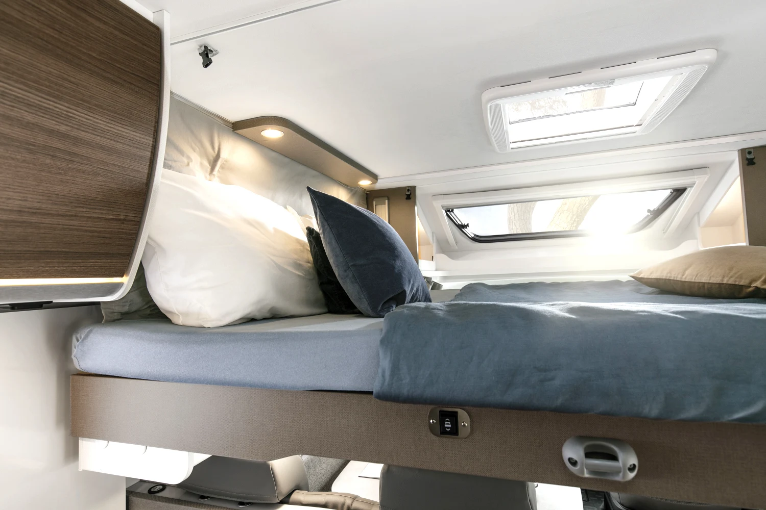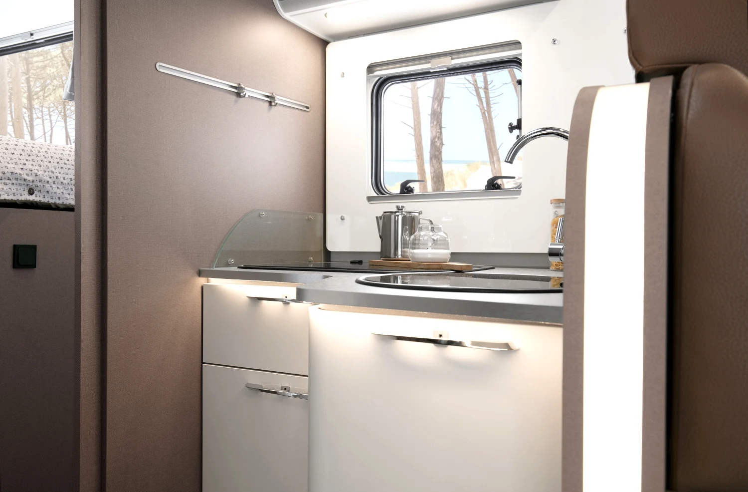 - energooszczędne oświetlenie LED w całym pojeździe, regulowane lampki w części sypialnej, zintegrowane oświetlenie LED pod szafkami