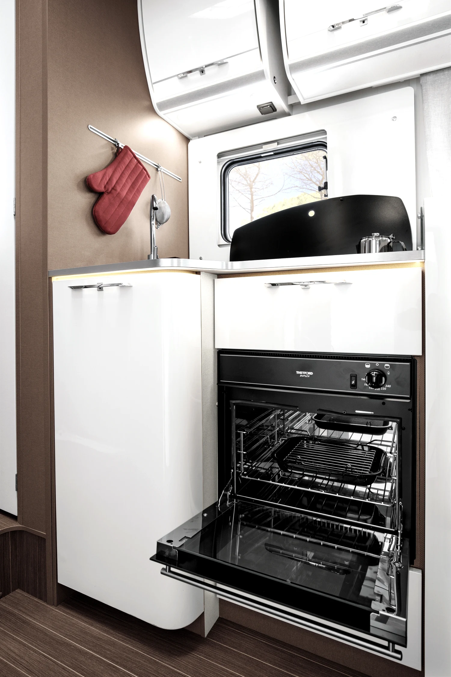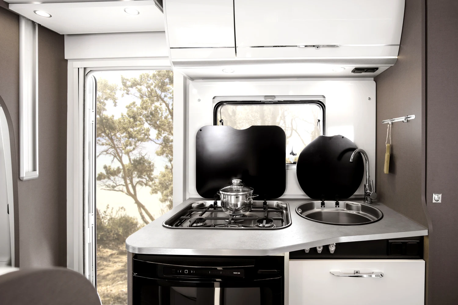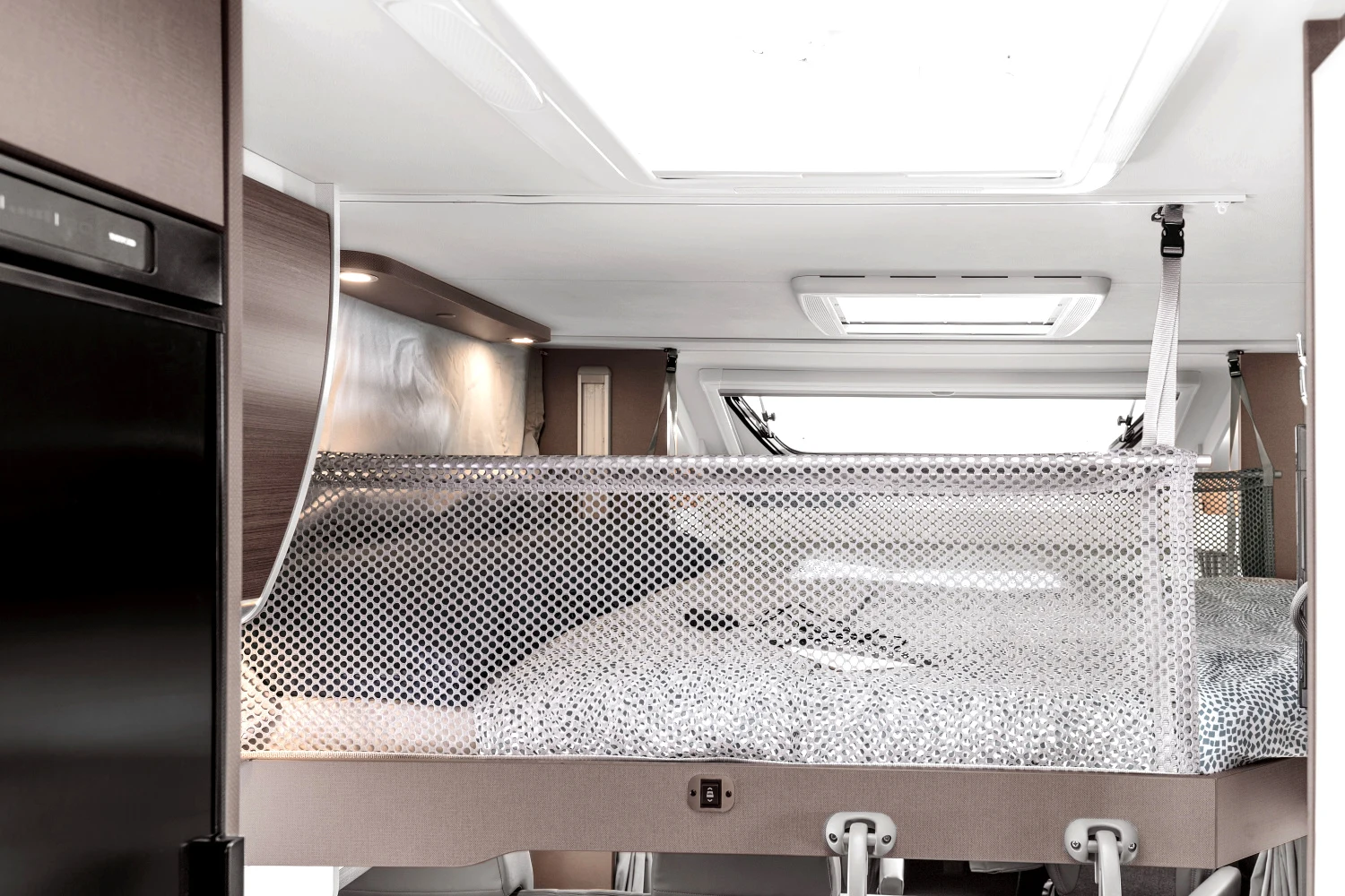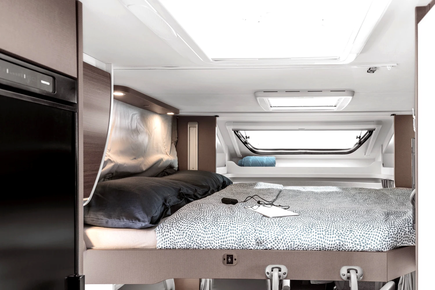 - energooszczędne oświetlenie LED w całym pojeździe, regulowane lampki w części sypialnej, zintegrowane oświetlenie LED pod szafkami