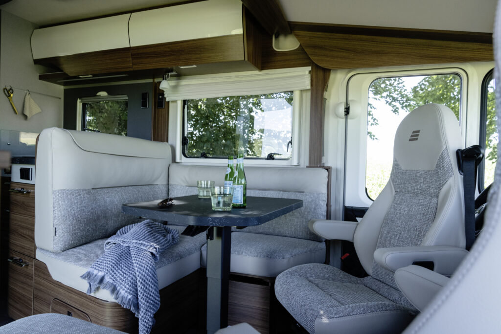 - Komfortowa grupa siedzeń w kształcie litery L z poduszkami wypoczynkowymi i przesuwnym stołem