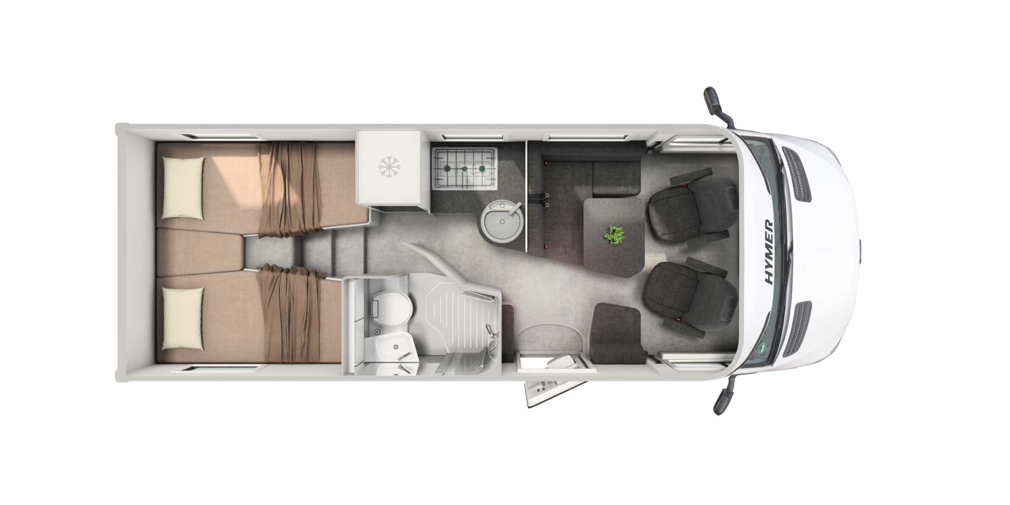 - Ergonomiczne fotele kapitańskie, tapicerowane tą samą tkaniną co reszta salonu, zapewniają komfort zarówno podczas jazdy, jak i postoju.