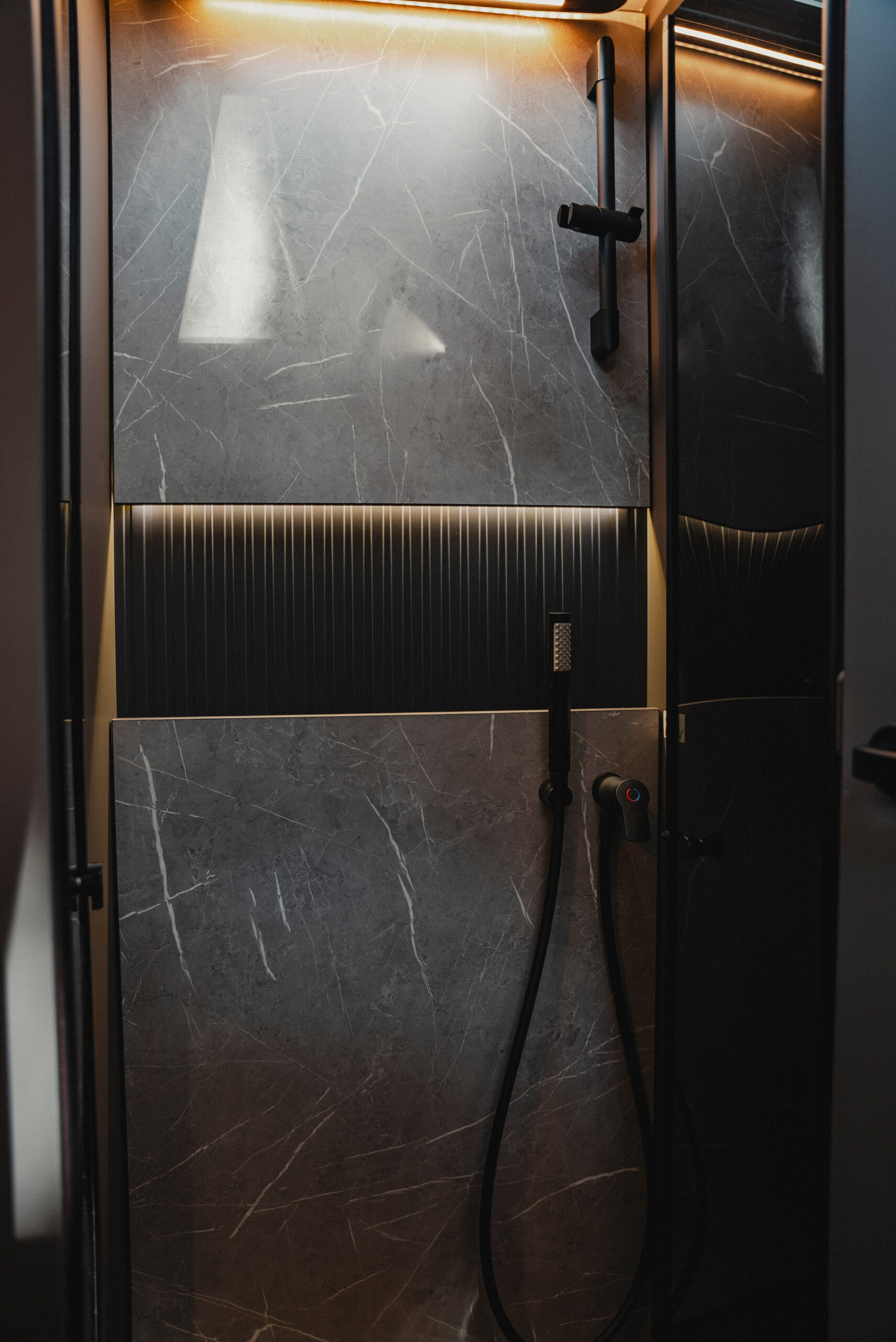 - Przestronna kabina prysznicowa z wysokiej jakości armaturą daje poczucie komfortu porównywalne z domową łazienką.