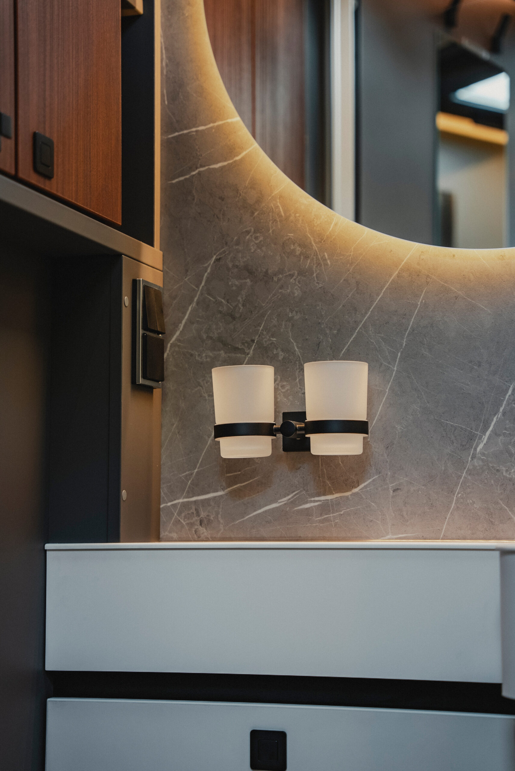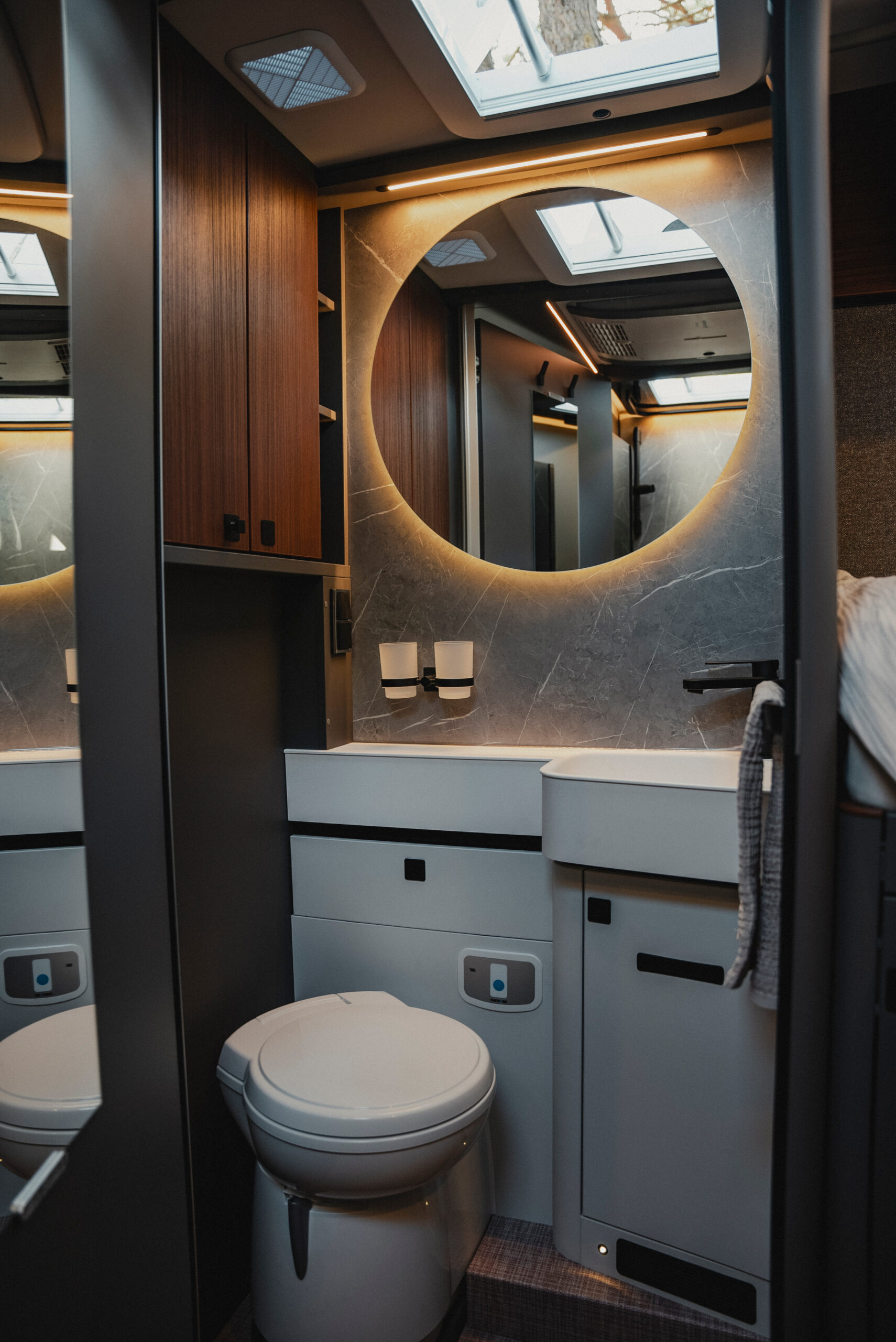 - Nastrojowe oświetlenie oraz matowe okno dachowe z roletą i moskitierą dopełniają wrażenia luksusu i prywatności.
