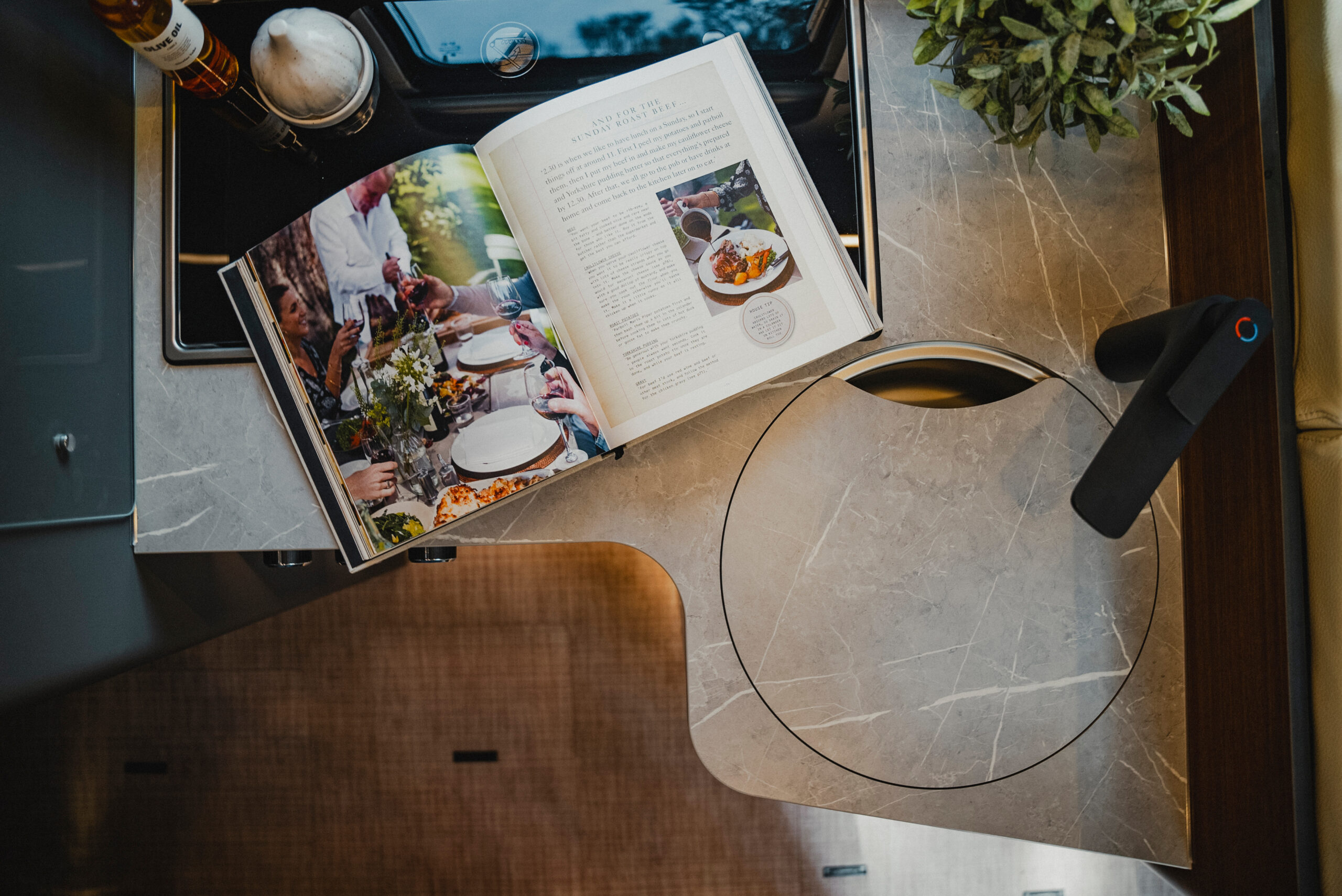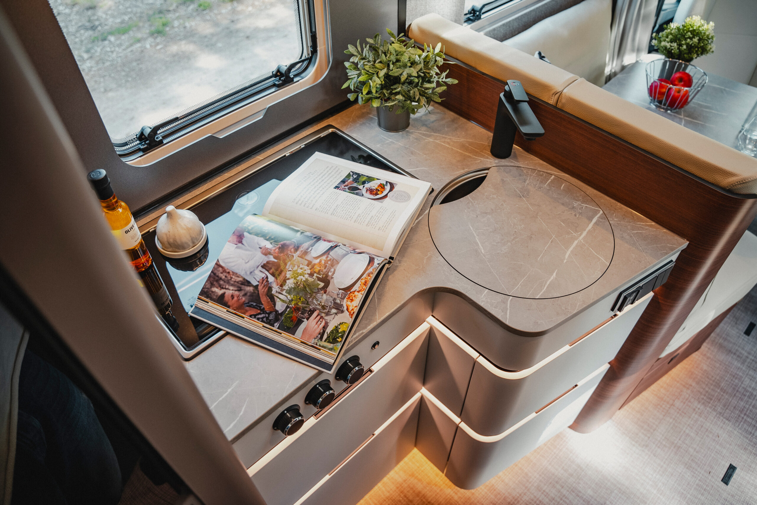 - Szerokie, w pełni wysuwane szuflady z systemem Soft-Close i elektryczną blokadą centralną ułatwiają organizację i zabezpieczają zawartość podczas jazdy.