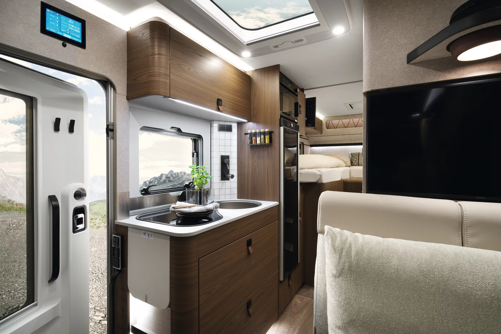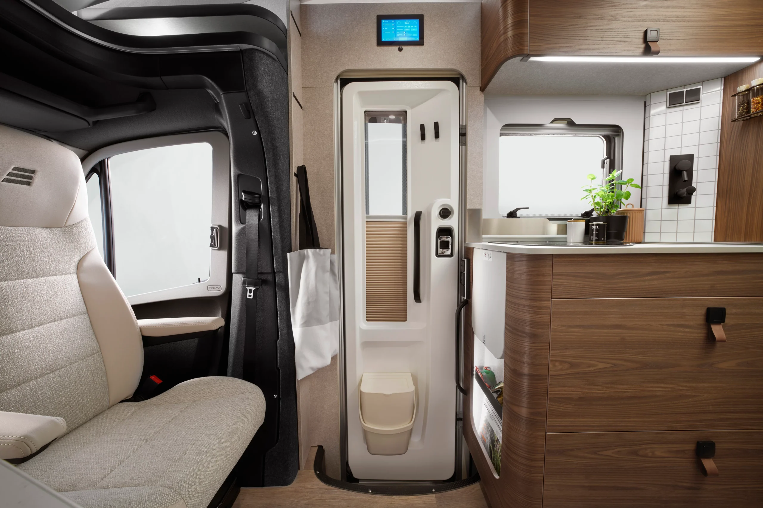 Przejmij pełną kontrolę nad swoim kamperem dzięki standardowemu systemowi HYMER Smart Connect. Zarządzaj ogrzewaniem, oświetleniem, sprawdzaj poziomy płynów i stan naładowania akumulatorów.