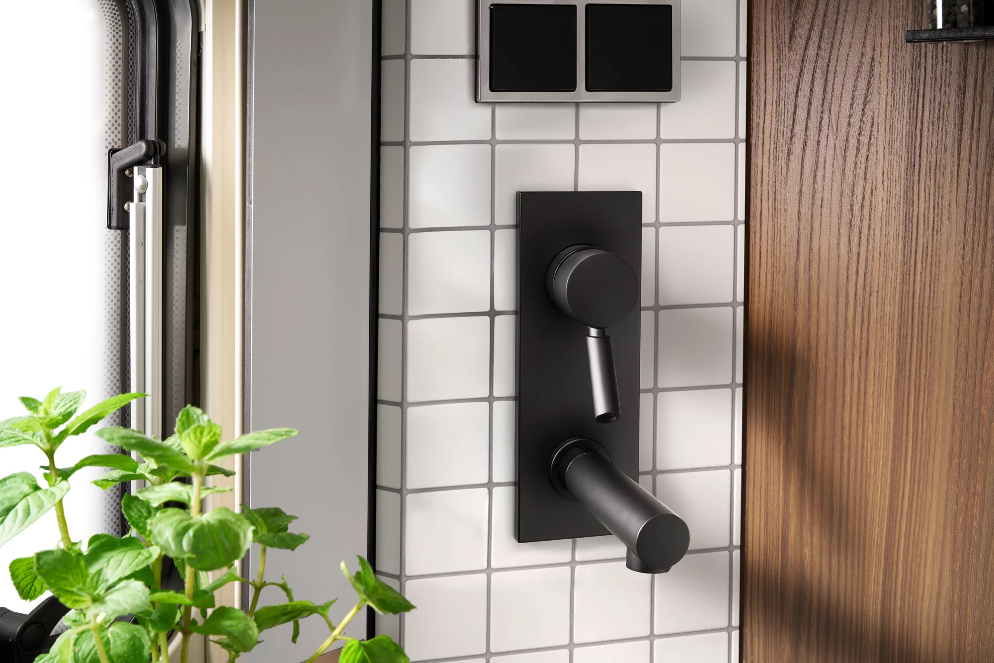 • Nowoczesny design przyciągający wzrok ścianą z prawdziwych płytek i matową, czarną armaturą.