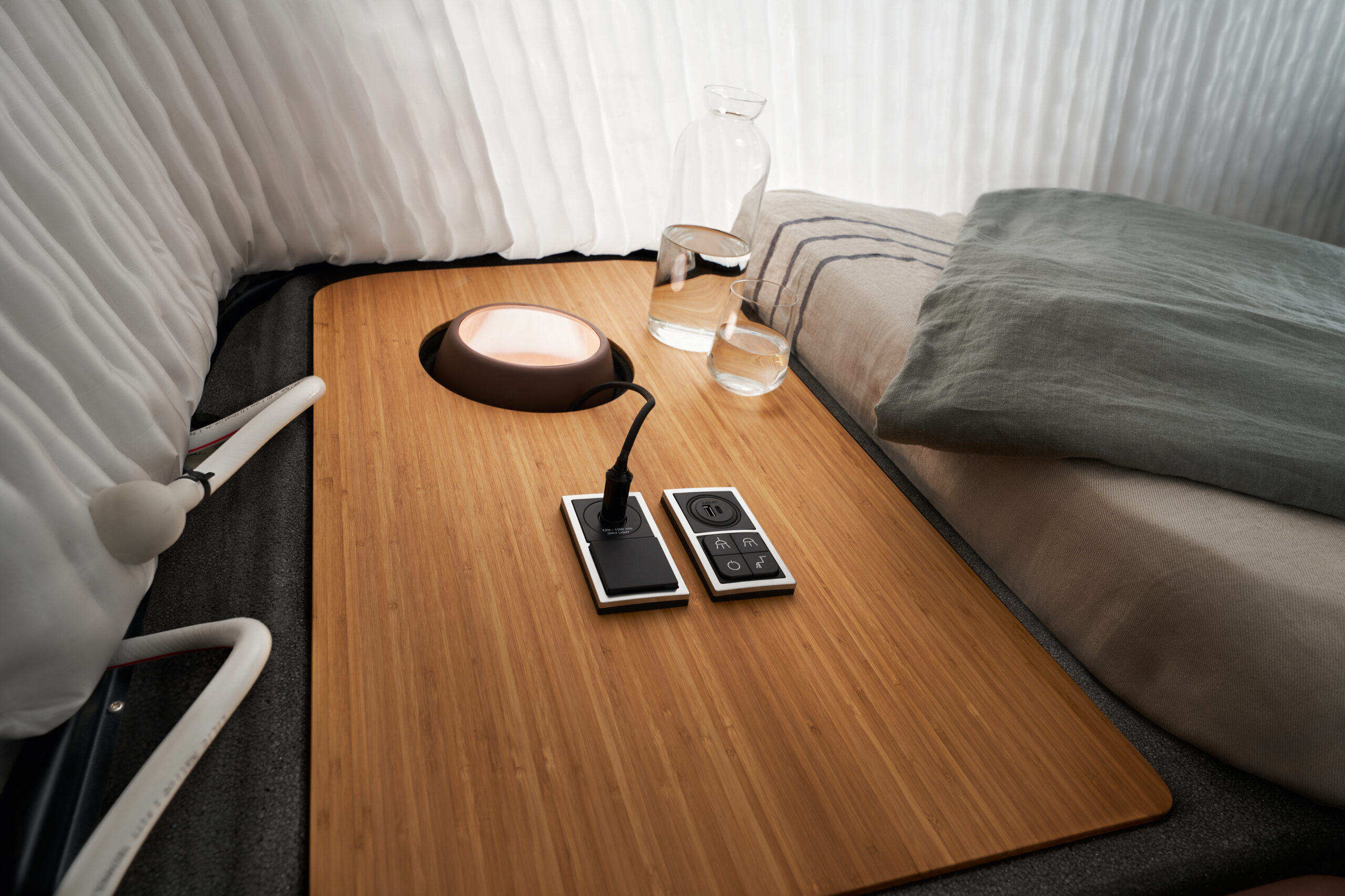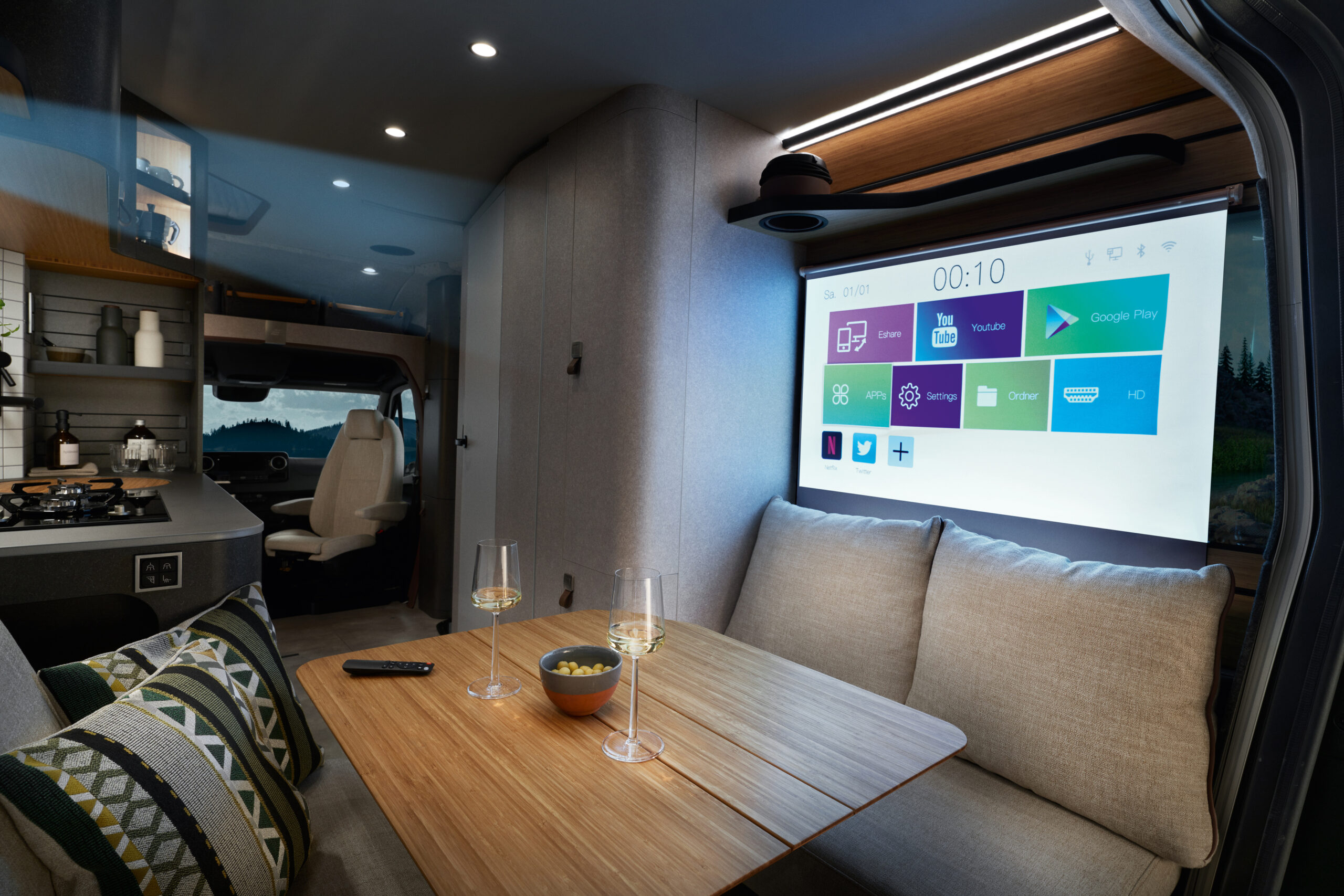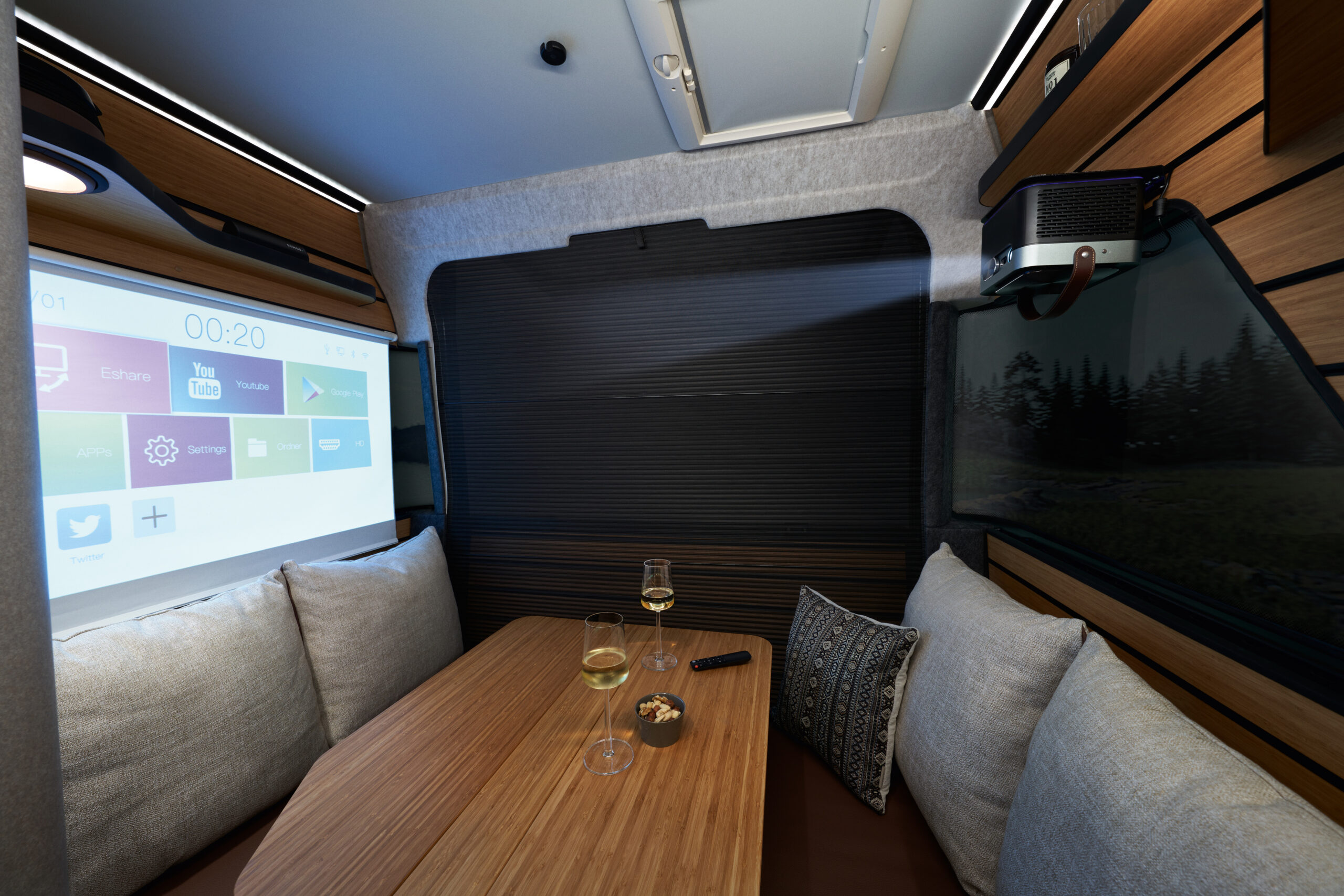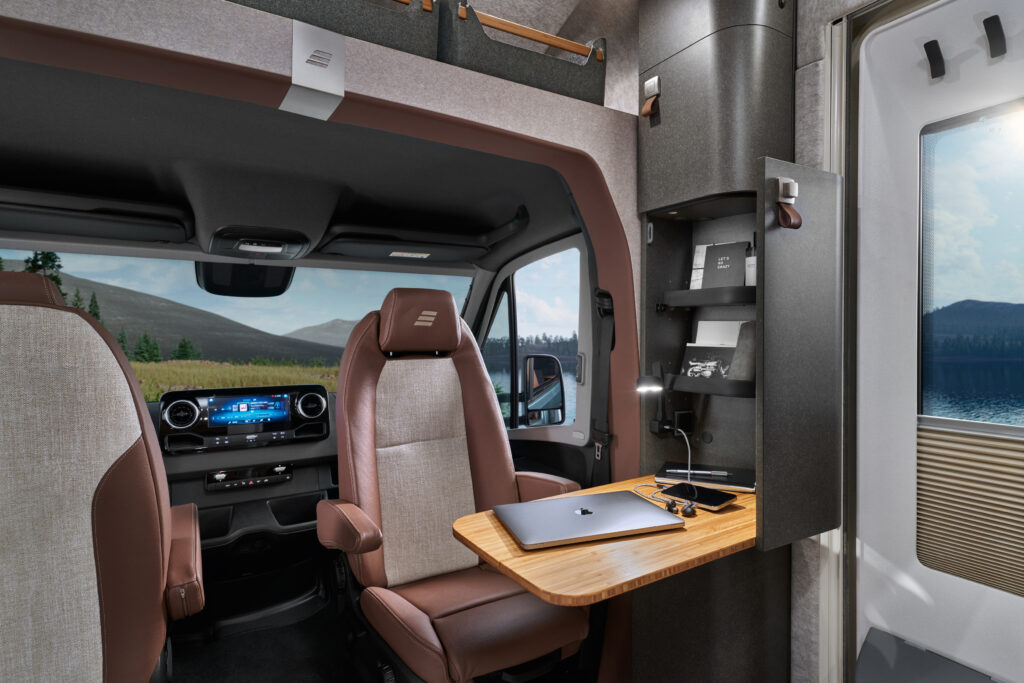 - Zintegrowane biuro domowe z biurkiem wbudowanym w ścianę boczną za fotelem pasażera, idealne do pracy zdalnej pod elastycznym świetlikiem dachowym
