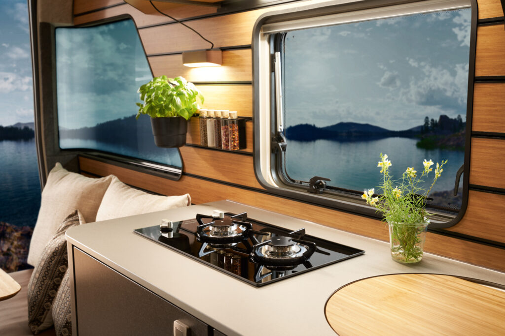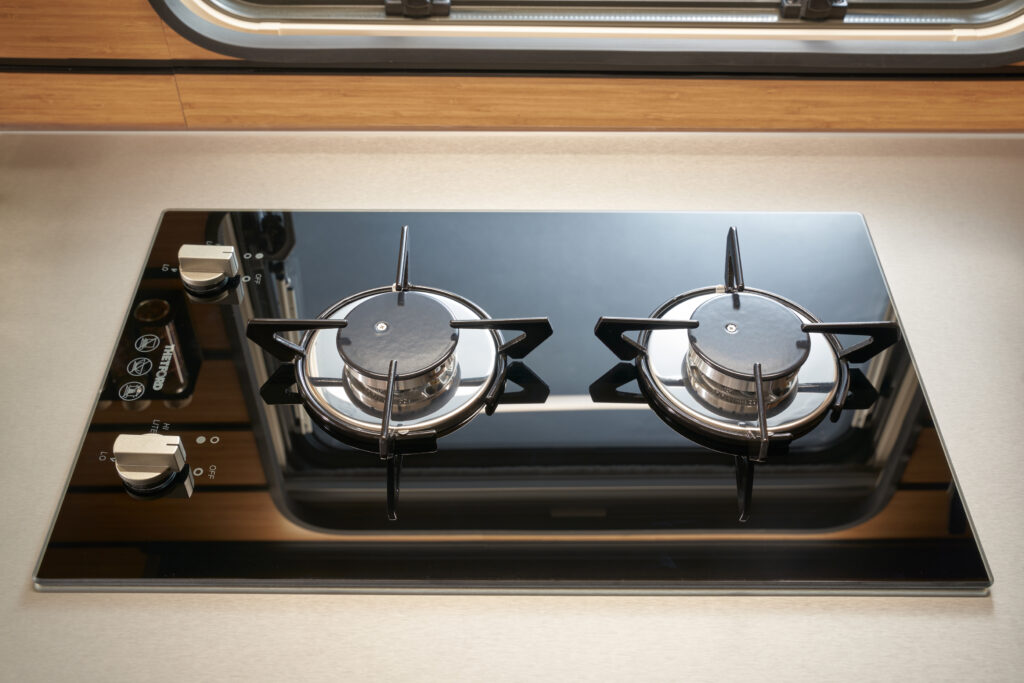 - Nowoczesna, w pełni wyposażona kuchenka z dwupalnikową kuchenką gazową i eleganckim, matowo-czarnym wykończeniem