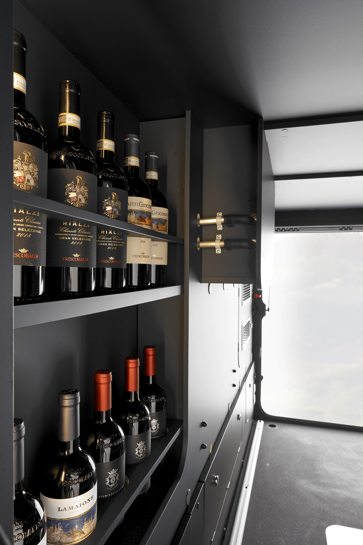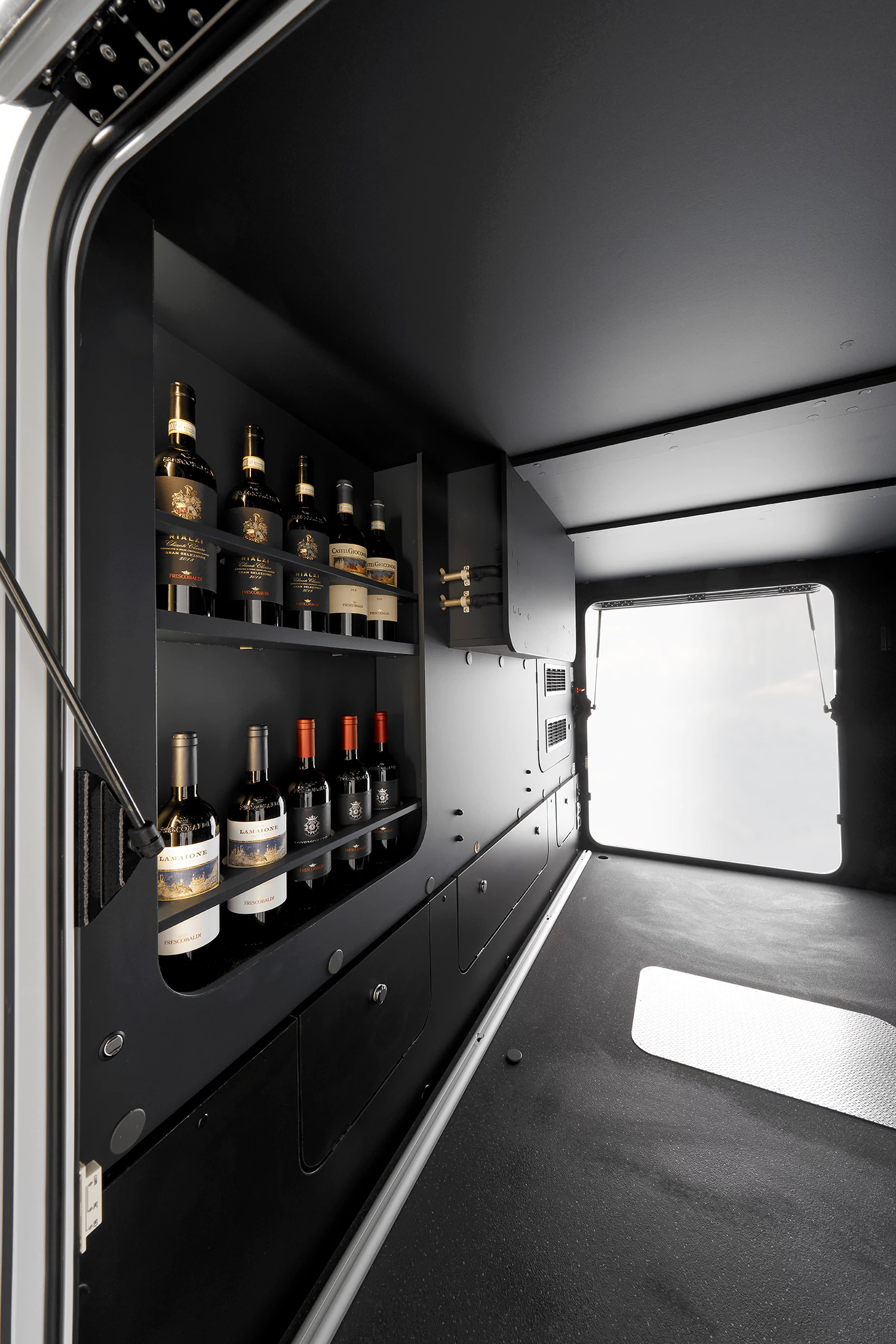 - garaż/schowek o pokaźnych rozmiarach w tylnej części pojazdu, ze specjalnymi półkami na wino