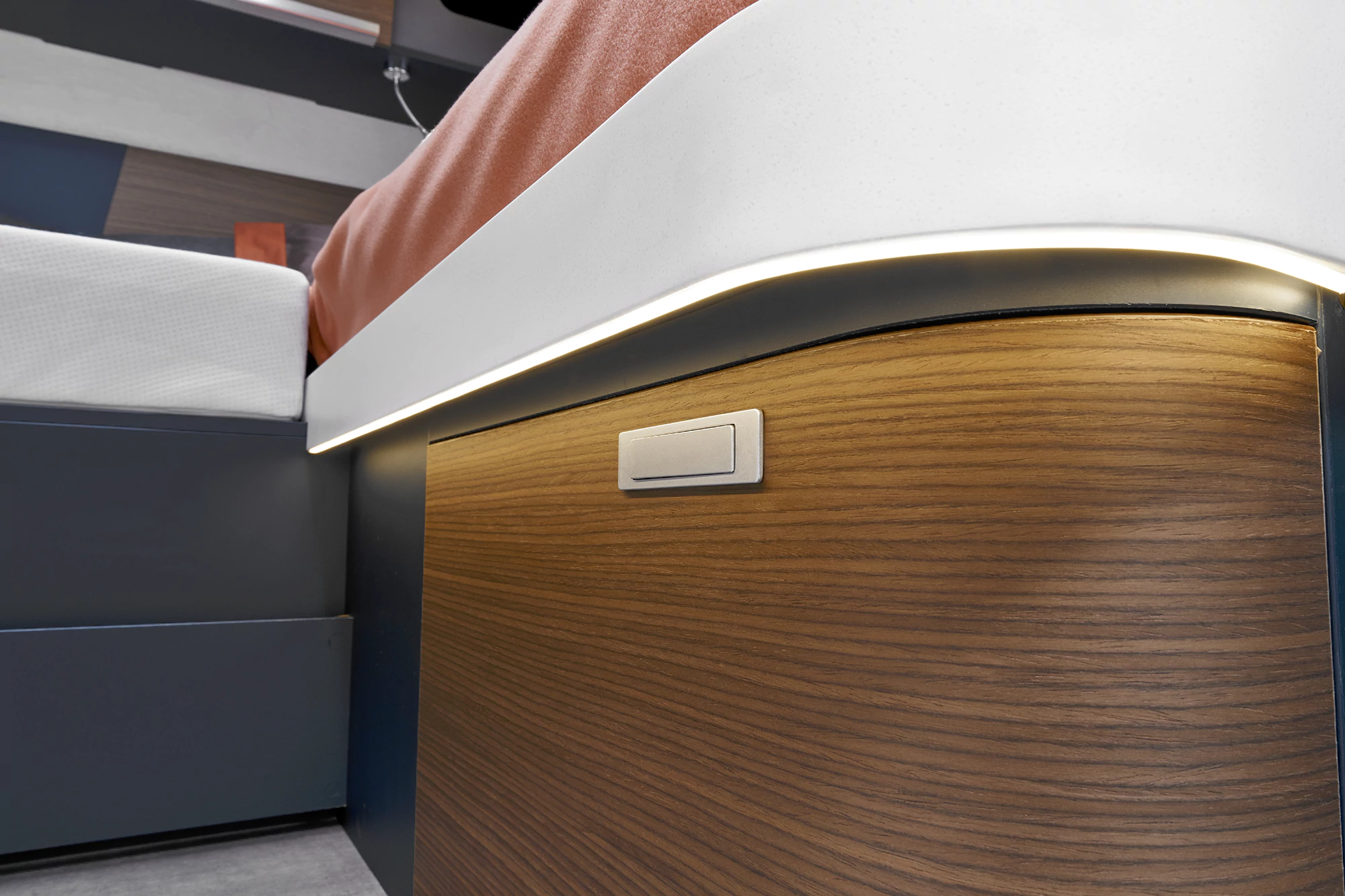 - opuszczane łóżko elektryczne nad kabiną kierowcy o wym. 195×140 cm, wyposażone w komfortowy materac piankowy